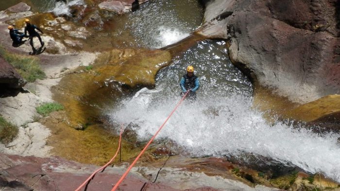 Ainsi, pour un parcours en demi-journée, le temps d’activité dans l’eau sera d’environ 2 heures en niveau 1 et 2h30 en niveau 2. Pour les sorties en journée complète, on passera environ 4 heures dans le canyon. Bien sûr, les temps d’activité varient un peu d’un groupe à l’autre…